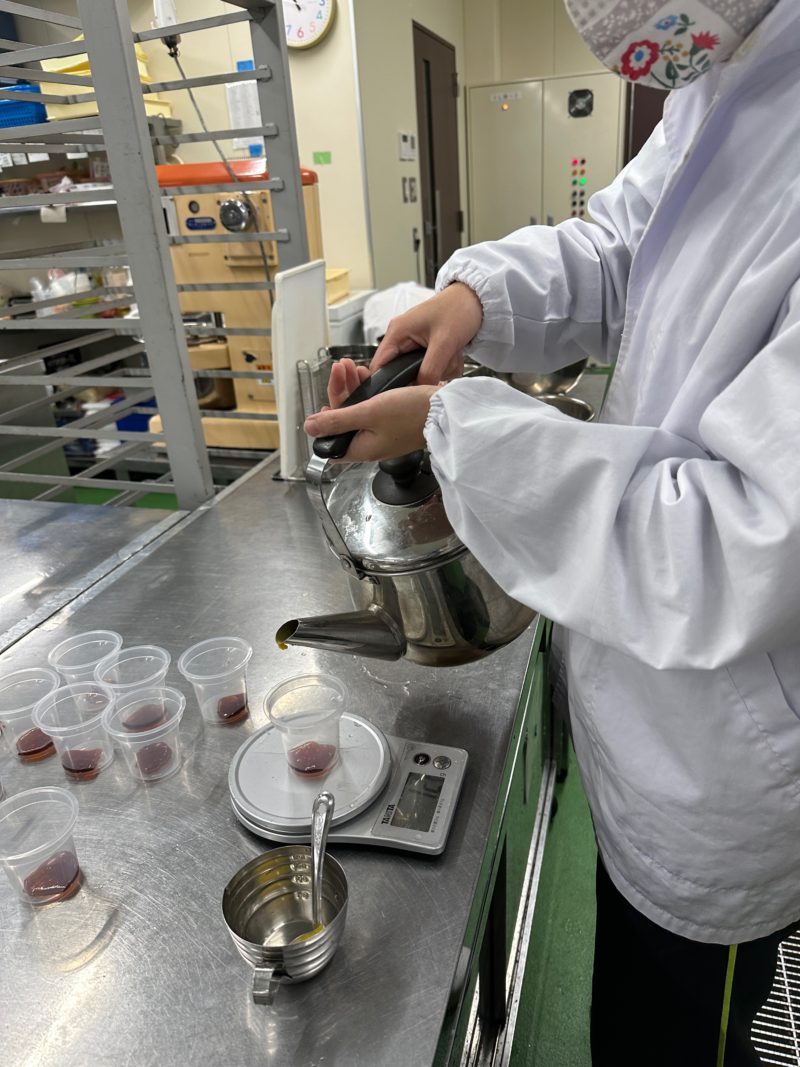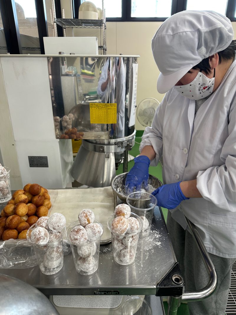 小麦粉を使うパンと同じ作業室ですが、作業を米粉を使う菓子部門・小麦粉を使うパン部門と小麦粉の混入を少しでも避けるためにそれぞれに班を分けて作業しています。